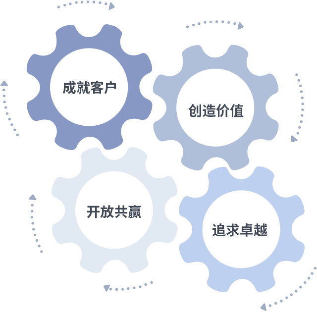 成就客户是一切决策的出发点,,,创造价值是衡量所有工作的标准,,,,追求卓越是我们做事做人的态度,,,开放共赢是我们的格局也是最终的结果。。。。价值观的齿轮环环相扣,,,,推动着组织里的每个人不断向前。。。。