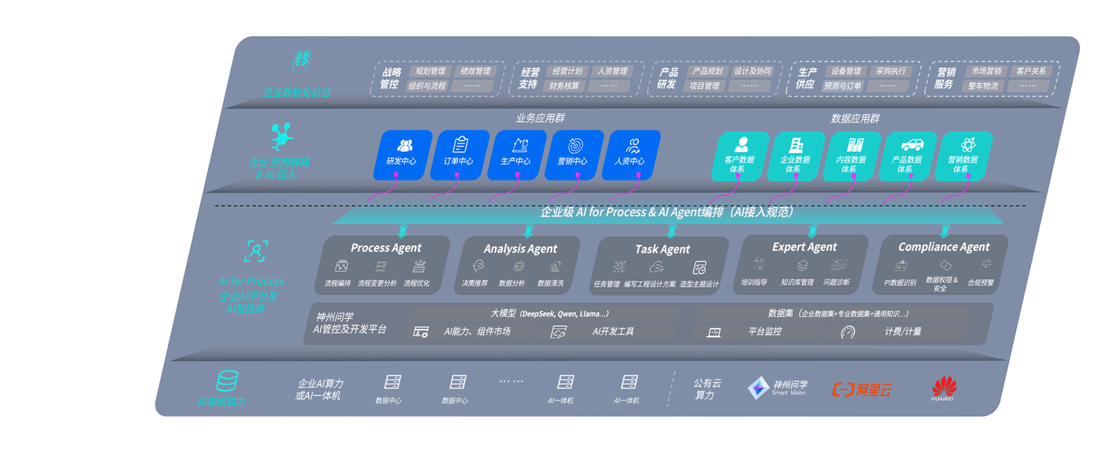 端到端的一站式AI工作空间深度融合了从企业战略规划到日常经营的全流程业务板块,,,,定向解决车企内部领域多、、、、部门多、、、链条长、、场景碎片化等难题,,支持车企快速构建以AI为核心的生产力写作体系,,,实现任务执行与AI能力的无缝集成与交互