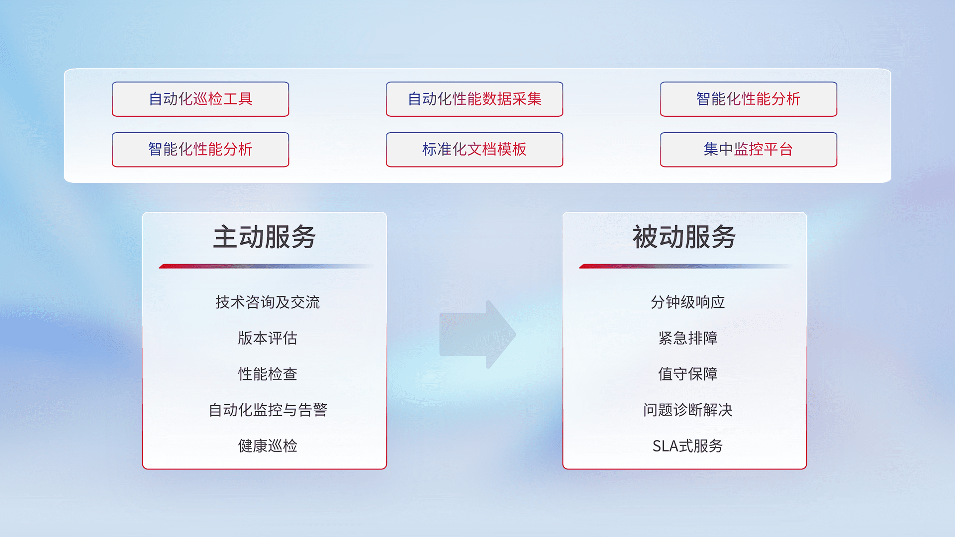 智能化工具和标准化文档,,,,保障服务质量,,,,提供主动服务(包含技术咨询、、、、版本评估、、、性能检查、、、、自动化监控与告警、、、、健康巡检)和被动服务包含(分钟级响应、、、、紧急排障、、、、值守保障、、、问题诊断解决、、SLA服务)。。